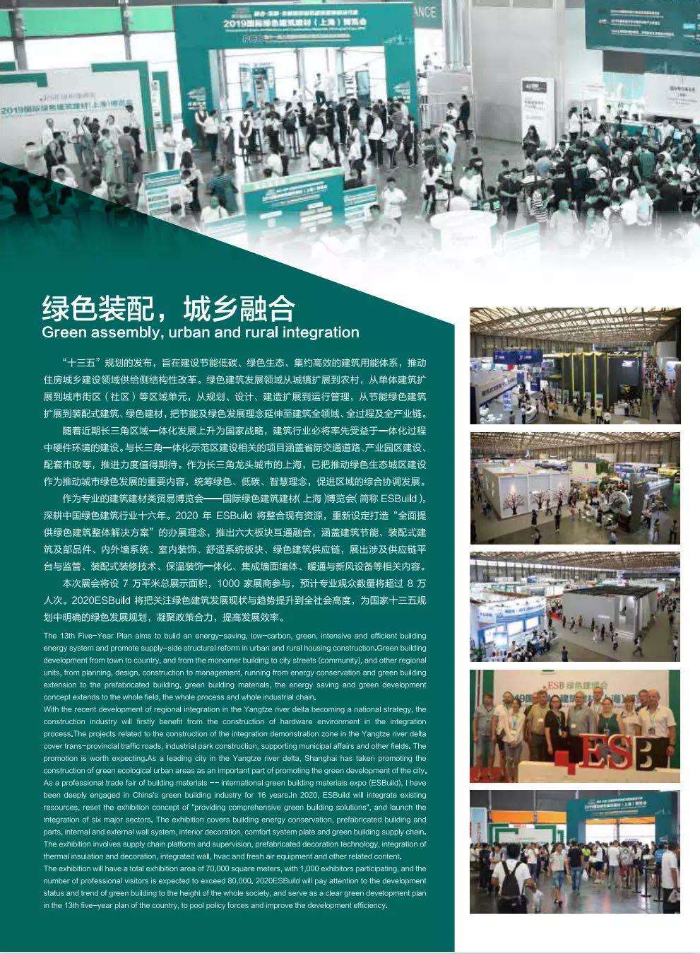 2020國際綠色建筑建材(上海)博覽會(huì)(2020ESBuild)于7月15日正式拉開帷幕。2020ESBuild以打造“全面提供綠色建筑整體解決方案”為理念,推出六大板塊互通融合,涵蓋建筑節(jié)能、裝配式建筑及部品件、內(nèi)外墻系統(tǒng)、室內(nèi)裝飾、舒適系統(tǒng)、綠色建筑供應(yīng)鏈,展出涉及供應(yīng)鏈平臺(tái)與監(jiān)管、裝配式裝修技術(shù)、保溫裝飾一體化、集成墻面墻體、暖通與新風(fēng)設(shè)備等相關(guān)內(nèi)容。