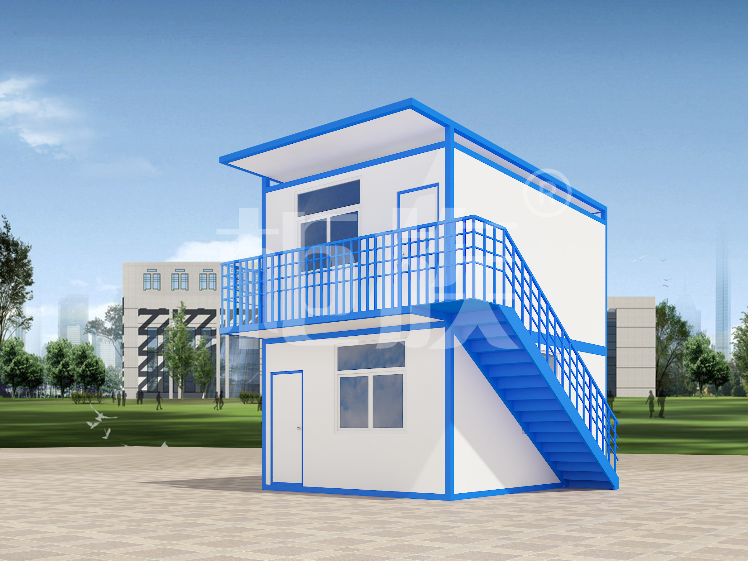 多個(gè)箱體拼接而成,藍(lán)白色的外觀簡(jiǎn)潔流暢。工廠生產(chǎn)、成品直接運(yùn)輸至使用場(chǎng)地,配套設(shè)施齊全,即到即用。
